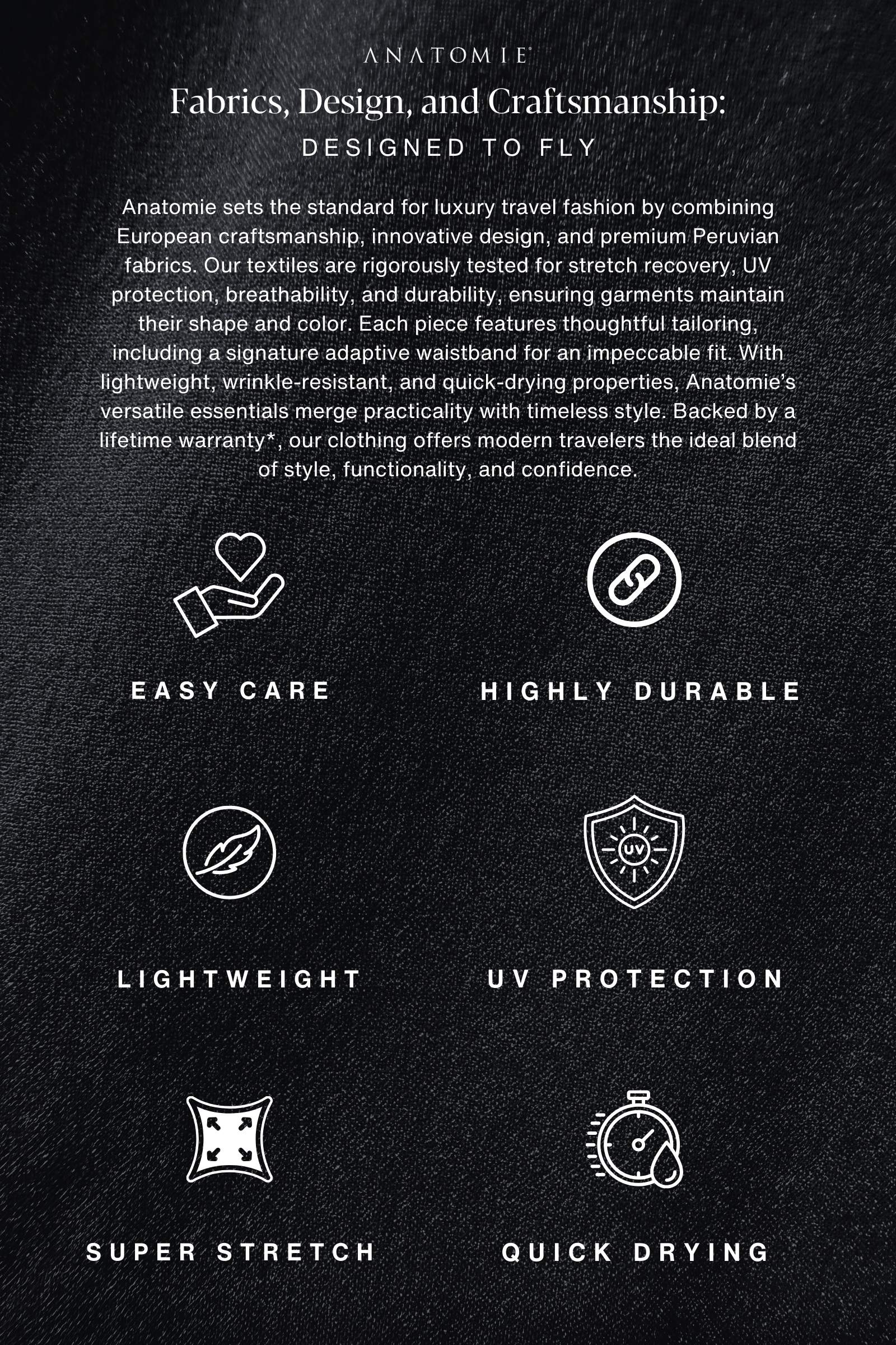 Designed with signature lightweight wrinkle-free European fabrics